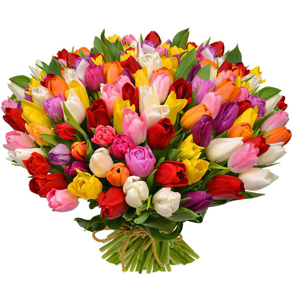 Акция! Тюльпаны 101 шт. — это великолепное зрелище для глаз, где яркие и насыщенные оттенки создают атмосферу радости и уюта. Удивительное разнообразие и гармония делают композицию уникальной, оставляя впечатление, которое долго не забывается.