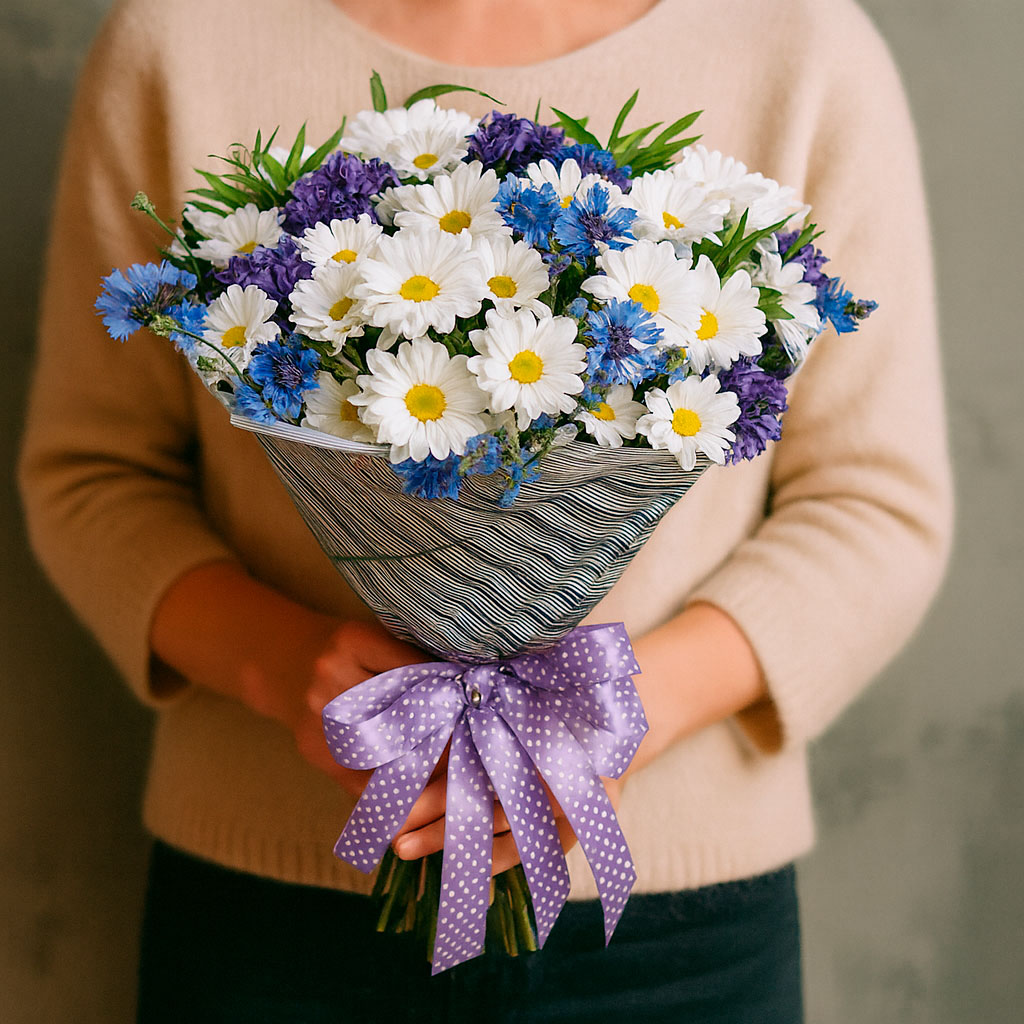 Яркие васильки и нежные ромашки создают гармоничное сочетание с зеленью, напоминая о летних лугах. Букет оформлен в матовую пленку с фиолетовой лентой в горошек. Возможны варианты с крафт-бумагой или декоративной сеткой. Прекрасный подарок для мамы на день рождения.