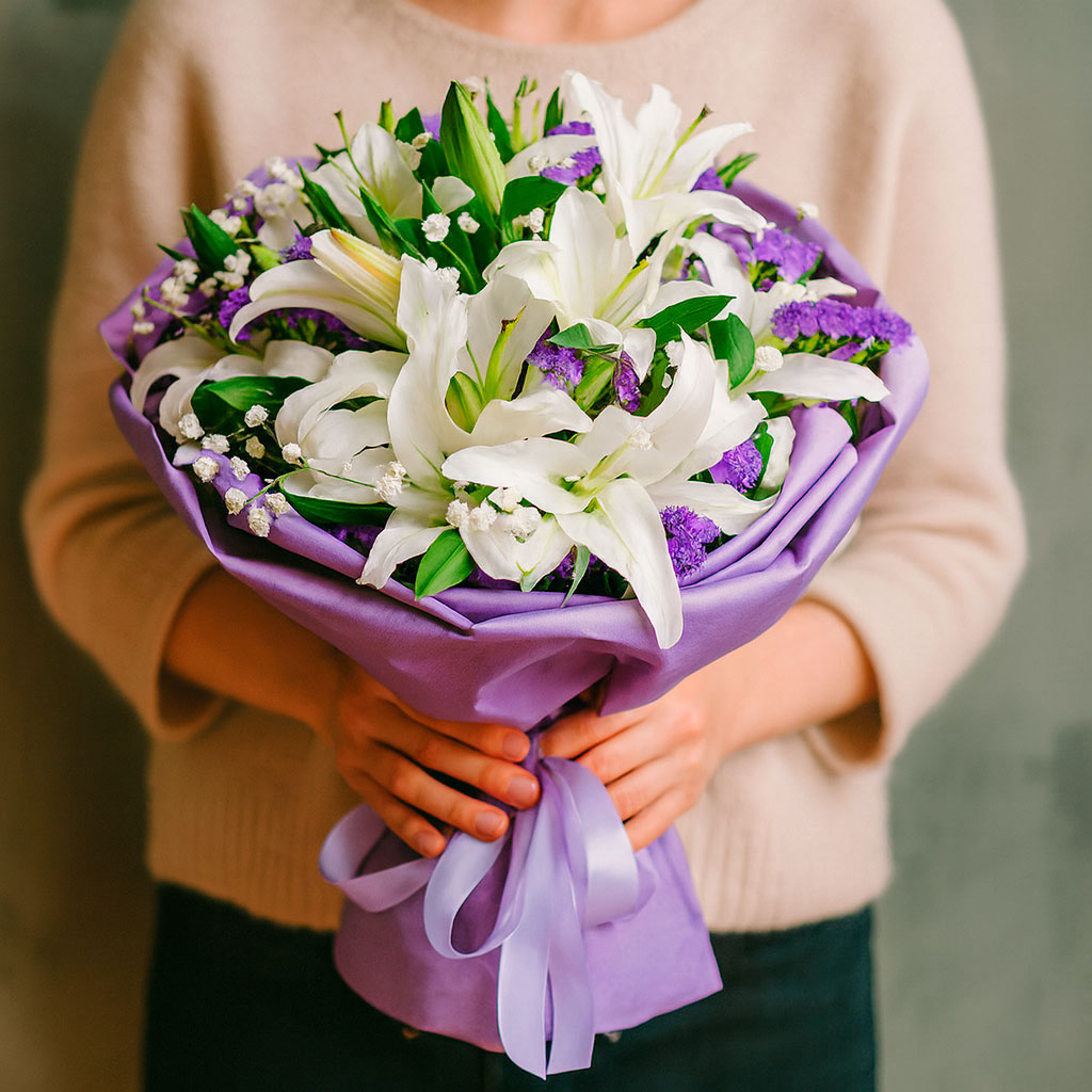 Белоснежные лилии в сочетании с нежной гипсофилой и яркой статицей создают изысканный букет. Упакован в фиолетовую матовую плёнку и перевязан атласной лентой. Альтернативные варианты оформления: крафт-бумага или декоративная сетка. Прекрасный подарок для жены на годовщину или для мамы на день рождения.