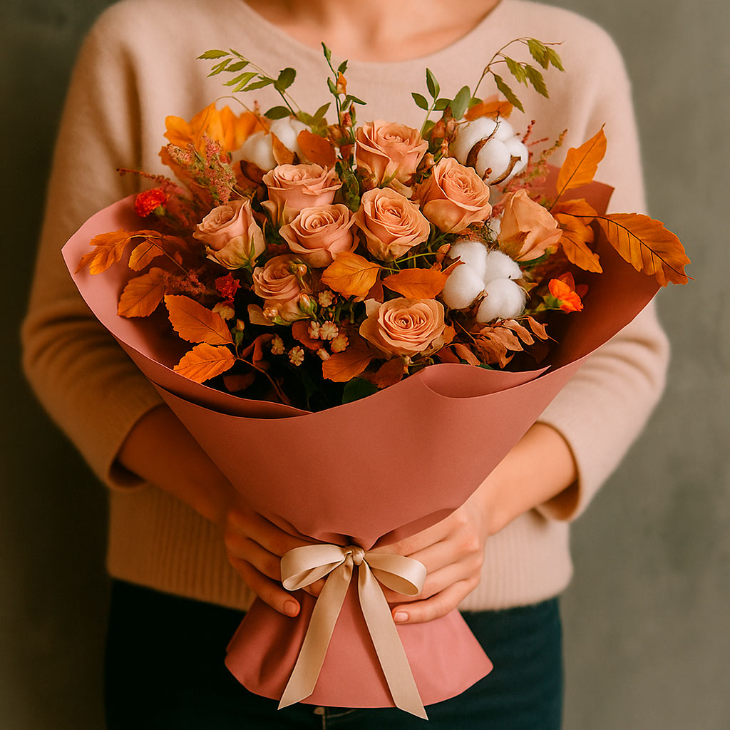Изящное сочетание винтажных кенийских роз, оранжевых кустовых гвоздик и восковой сливы создаёт атмосферу утончённой элегантности. Дополняют композицию ваксфлауэр, рисовый цветок и хлопок, придавая букету воздушность и лёгкость. Упакован в матовую плёнку нежно-розового цвета с атласной лентой. Возможны альтернативы упаковки: крафт-бумага или декоративная сетка. Прекрасный выбор для подарка на годовщину для любимой.