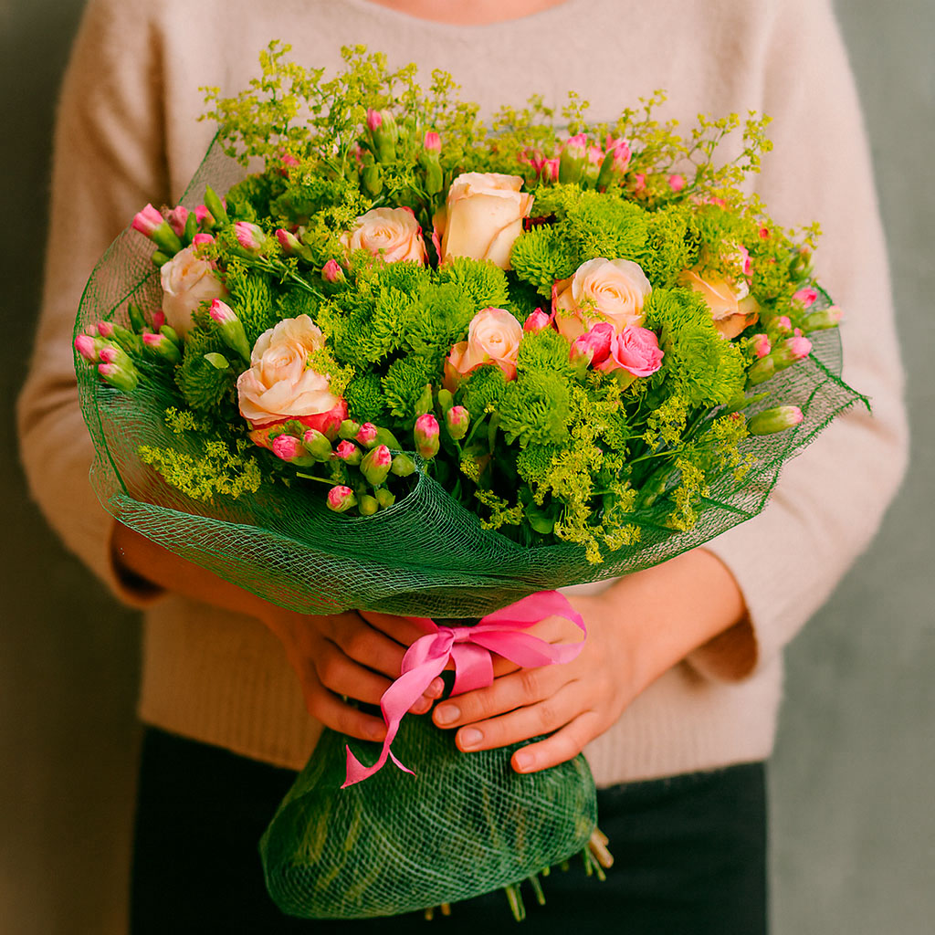 Кремовые розы, зеленые хризантемы и розовые кустовые гвоздики создают нежную и гармоничную композицию, дополненную зеленью. Букет оформлен в матовую пленку и перевязан розовой лентой. Альтернативные варианты упаковки: крафт-бумага или декоративная сетка. Подойдет для поздравления на день рождения или для любимой.