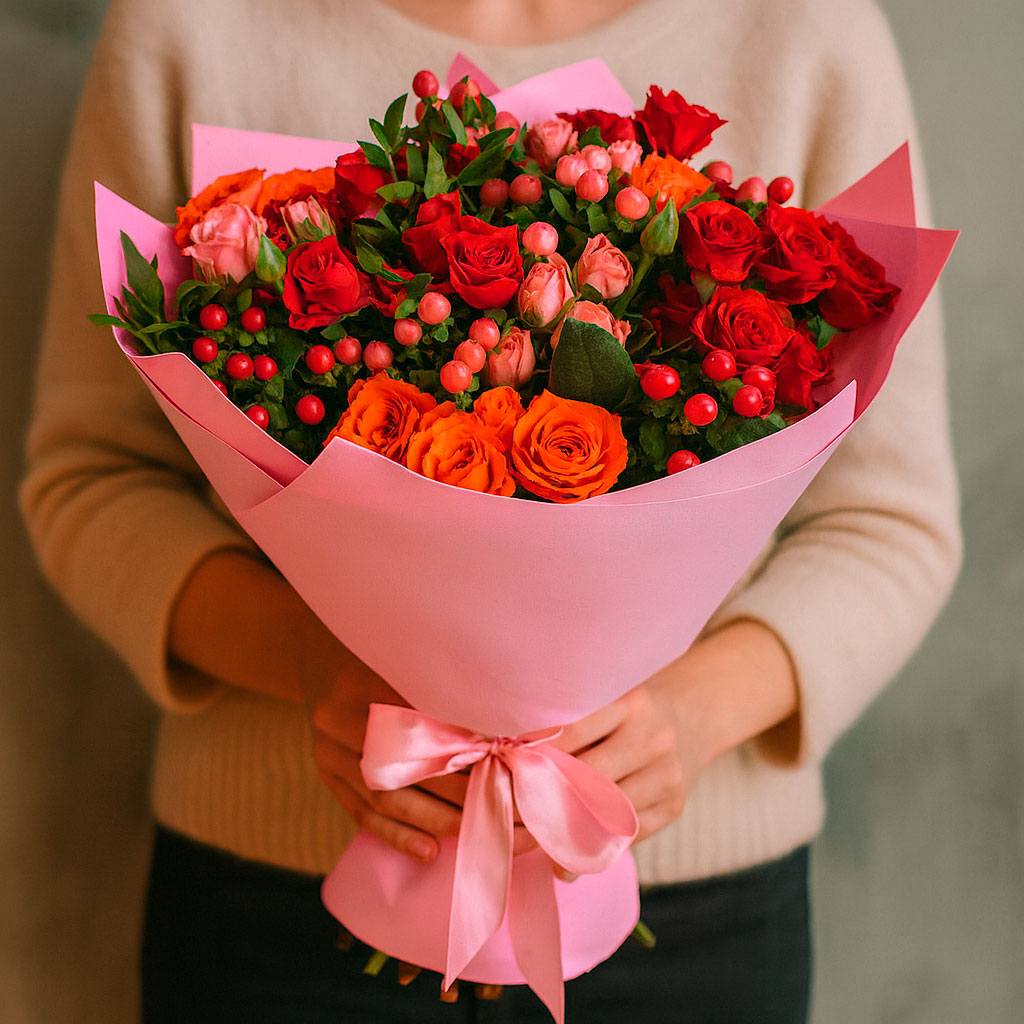 Роскошное сочетание кустовых роз в розовых и красных тонах, дополненное гиперикумом и свежей зеленью, создаёт атмосферу праздника. Букет оформлен в матовую плёнку нежного розового цвета и перевязан атласной лентой. Возможны варианты упаковки с крафт-бумагой или декоративной сеткой. Прекрасный подарок для любимой на день рождения или годовщину.