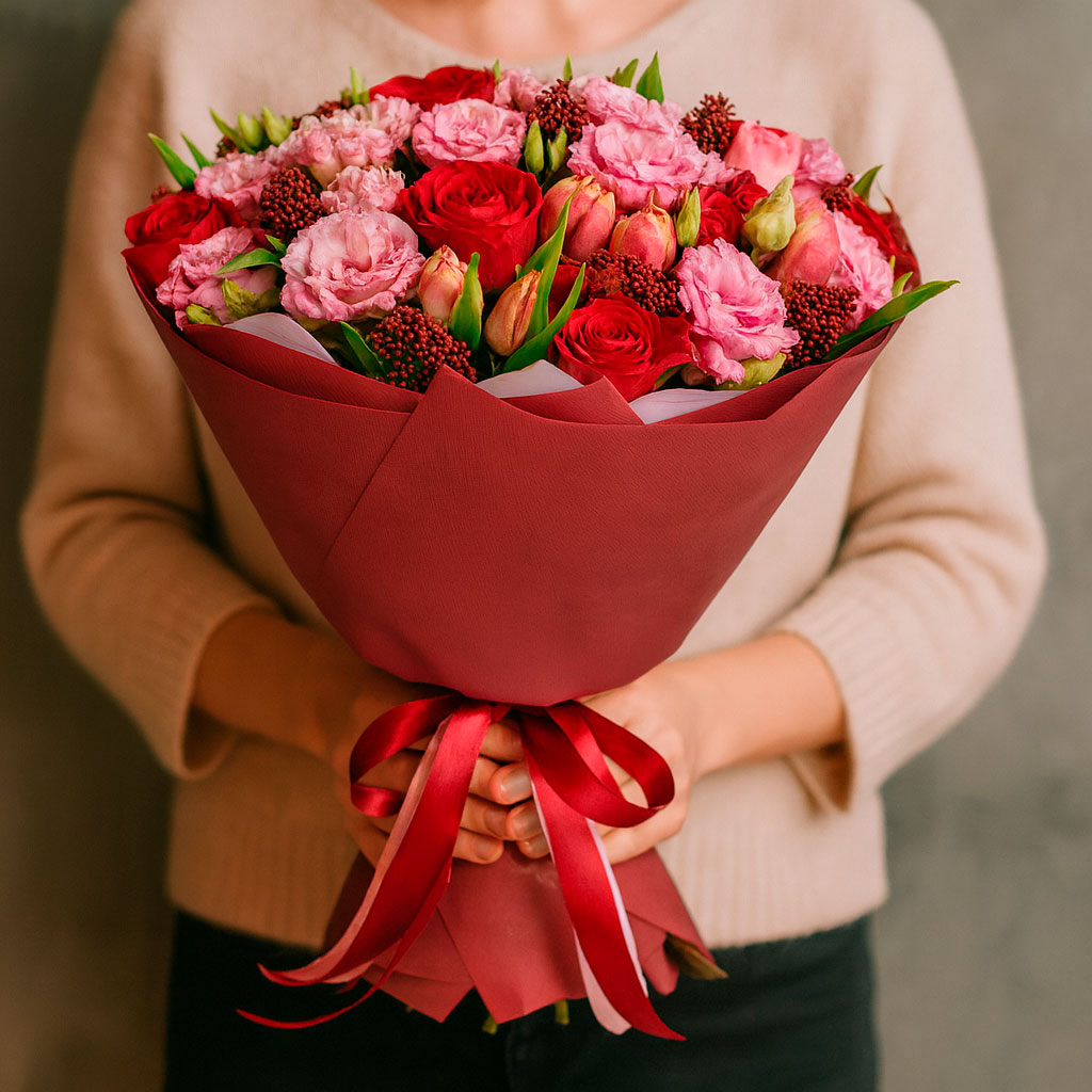 Роскошный букет сочетает в себе красные розы, розовые тюльпаны и нежные розовые эустомы, дополненные озотамнусом. Упакован в матовую пленку и крафт-бумагу, перевязанную атласной лентой. Альтернативные варианты упаковки: фетр или декоративная сетка. Прекрасный подарок для любимой на годовщину или на 8 марта.