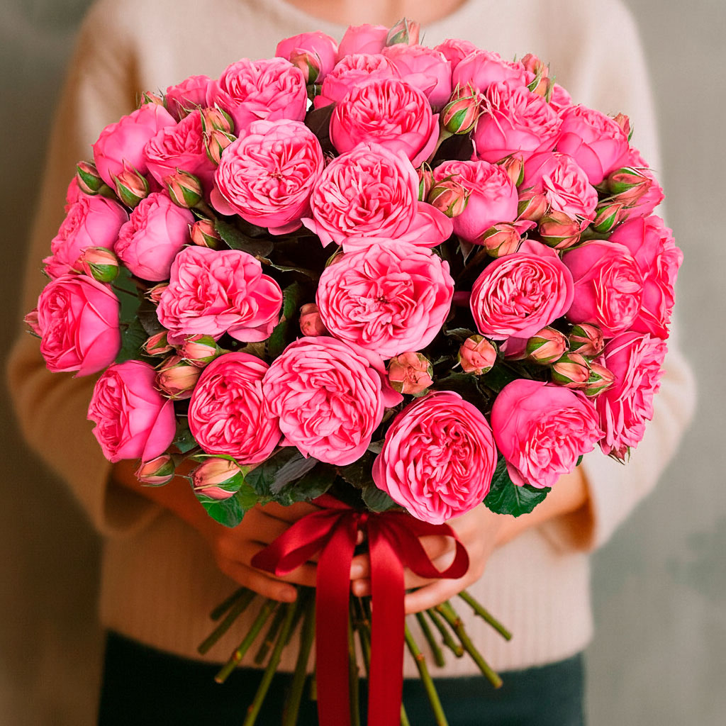 Пионовидные розовые розы создают атмосферу нежности и романтики. Букет перевязан атласной лентой, подчеркивающей его изысканность. Возможны другие варианты упаковки: матовая плёнка или крафт-бумага. Прекрасный подарок для любимой на 8 марта.