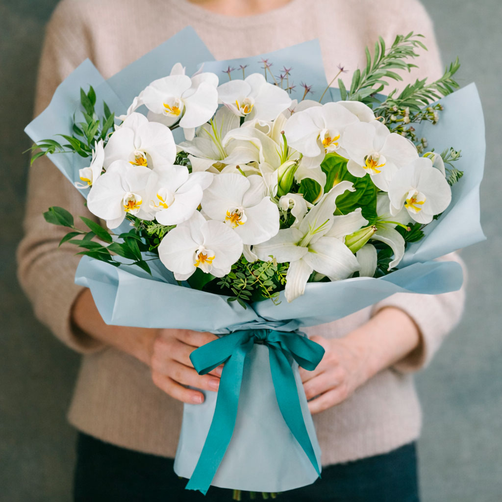 Изящный букет из белых орхидей «Бабочка», белых лилий и ваксфлауэра, дополненный свежей зеленью, создает атмосферу чистоты и элегантности. Упакован в матовую пленку нежно-голубого оттенка и перевязан атласной лентой. Возможны альтернативы оформления: крафт-бумага или декоративная сетка. Прекрасный выбор для годовщины или на свадьбу, чтобы порадовать любимую или жену.