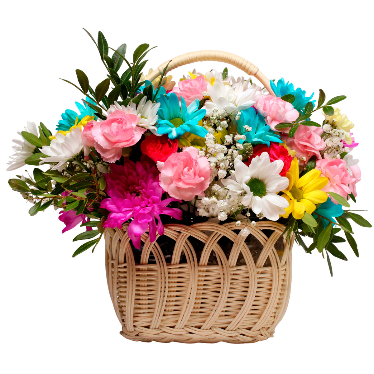 Яркие хризантемы разных оттенков в сочетании с нежной гипсофилой и зеленью фисташки создают гармоничную композицию. Корзина из ротанга добавляет естественности и лёгкости. Возможны альтернативы оформления: корзина из лозы или с тканевой отделкой. Прекрасный подарок для мамы на день рождения или юбилей.