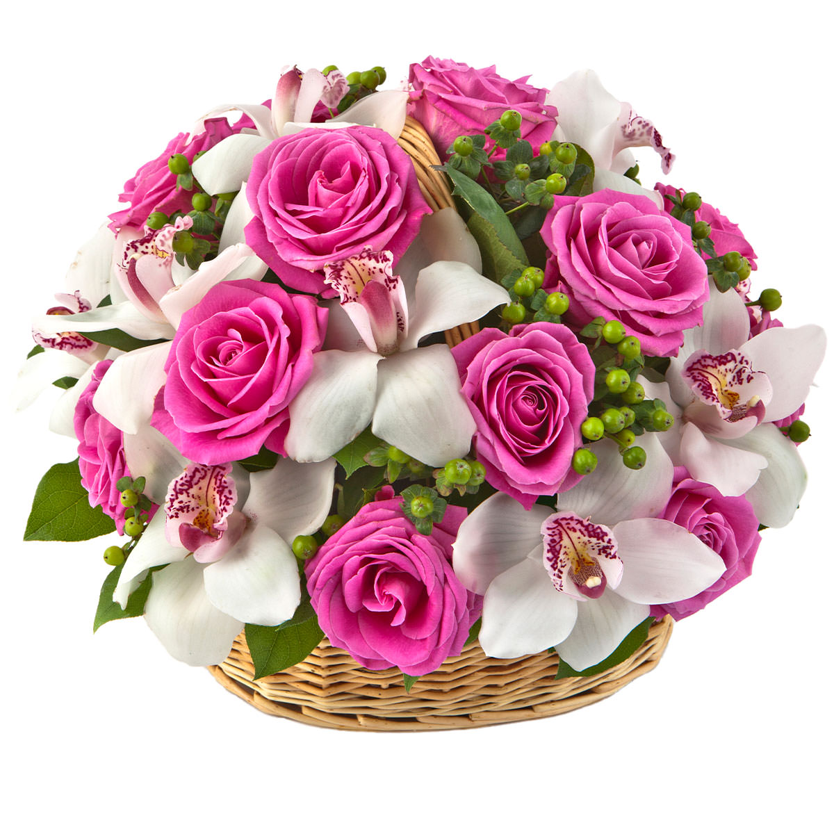 Розовые одноголовые розы и белые орхидеи создают нежное сочетание с гиперикумом в плетёной корзине. Композиция оформлена в натуральной корзине, добавляя природного очарования. Возможны альтернативы оформления в корзине из лозы или с тканевой отделкой. Подойдёт для поздравления любимой на день рождения или для украшения свадебного стола.
