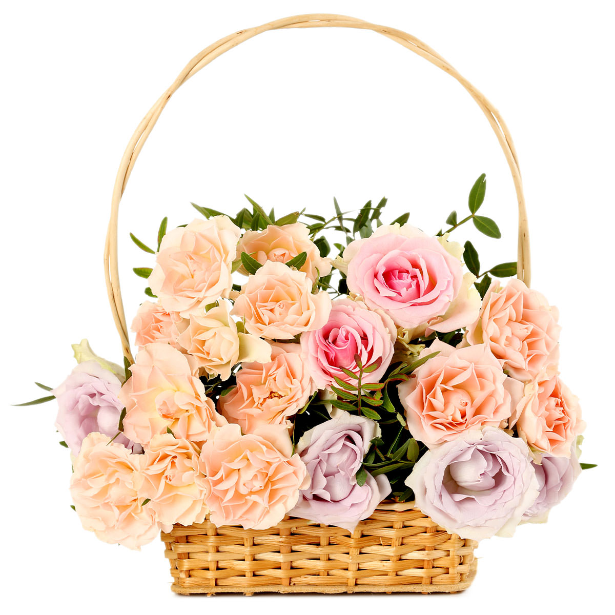 Роскошная корзина с розовыми, сиреневыми и персиковыми розами, дополненная фисташкой, создает атмосферу нежности и утонченности. Упакована в плетёную корзину, которая подчеркивает естественную красоту цветов. Возможны альтернативы: корзина из лозы или с тканевой отделкой. Прекрасный выбор для годовщины или для любимой.