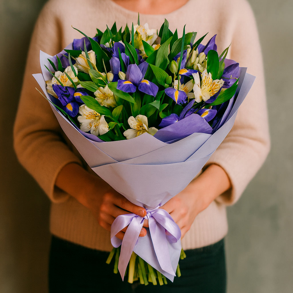 Ирисы и белые альстромерии создают гармоничное сочетание, дополняемое свежей зеленью. Букет оформлен в матовую пленку и перевязан атласной лентой нежного оттенка. Возможны альтернативы упаковки: крафт-бумага или декоративная сетка. Подходит для подарка на день рождения или для любимой.