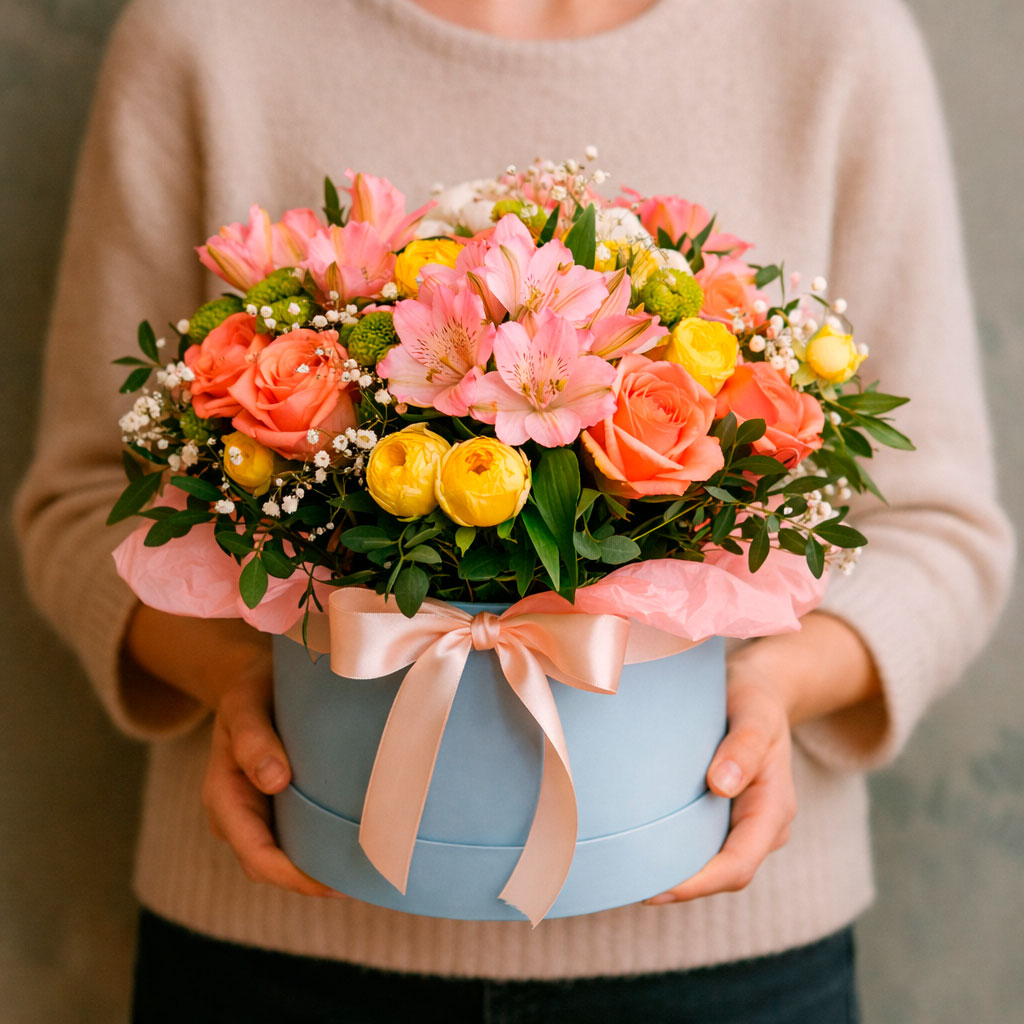 Яркие оранжевые розы, нежные желтые кустовые пионы и розовые альстромерии создают гармоничную цветочную композицию. Зеленые хризантемы и гипсофила добавляют свежести и легкости. Композиция оформлена в голубой шляпной коробке, что подчеркивает её элегантность. Возможны альтернативы оформления в бархатной или атласной коробке. Прекрасный подарок для любимой на день рождения или годовщину.