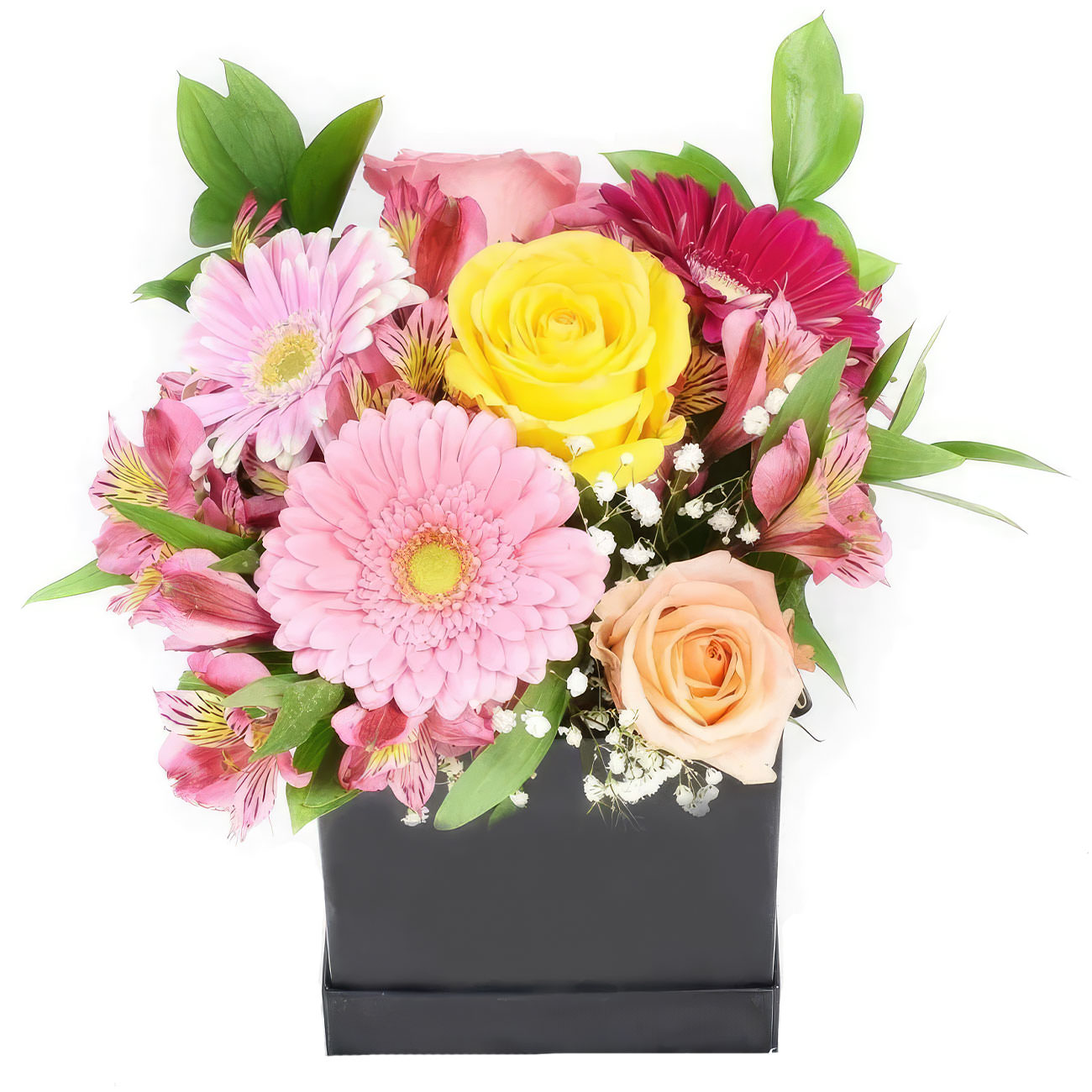 Яркие розовые и сиреневые герберы, персиковые розы и нежная розовая альстромерия создают гармоничную композицию. Гипсофила добавляет воздушности и лёгкости. Цветы оформлены в стильной чёрной квадратной коробке. Возможны варианты оформления в бархатной или атласной коробке. Прекрасный подарок для любимой на день рождения.